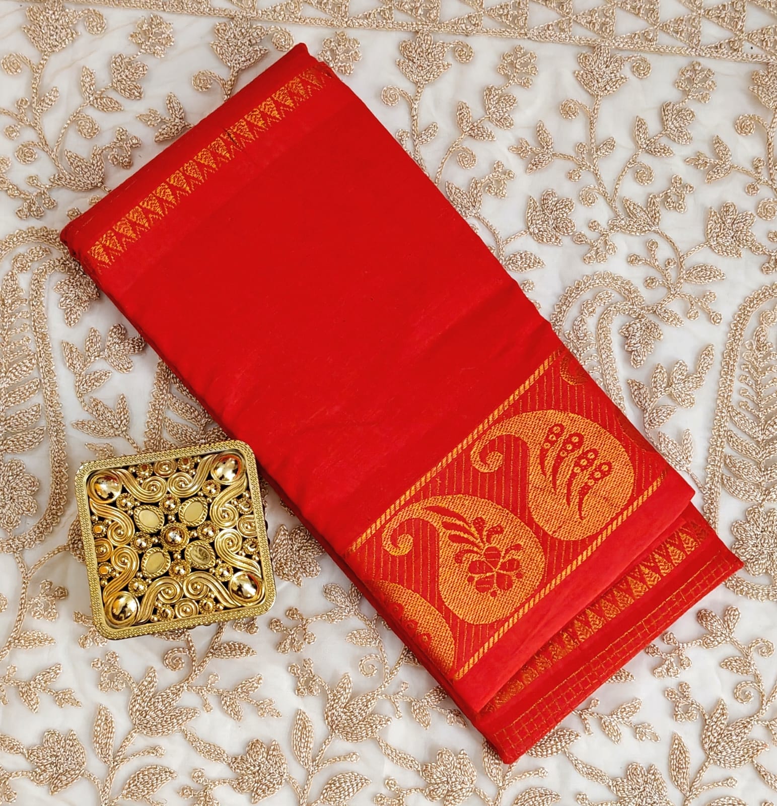 • ✨ Golden Zari Border with Paisley Motifs