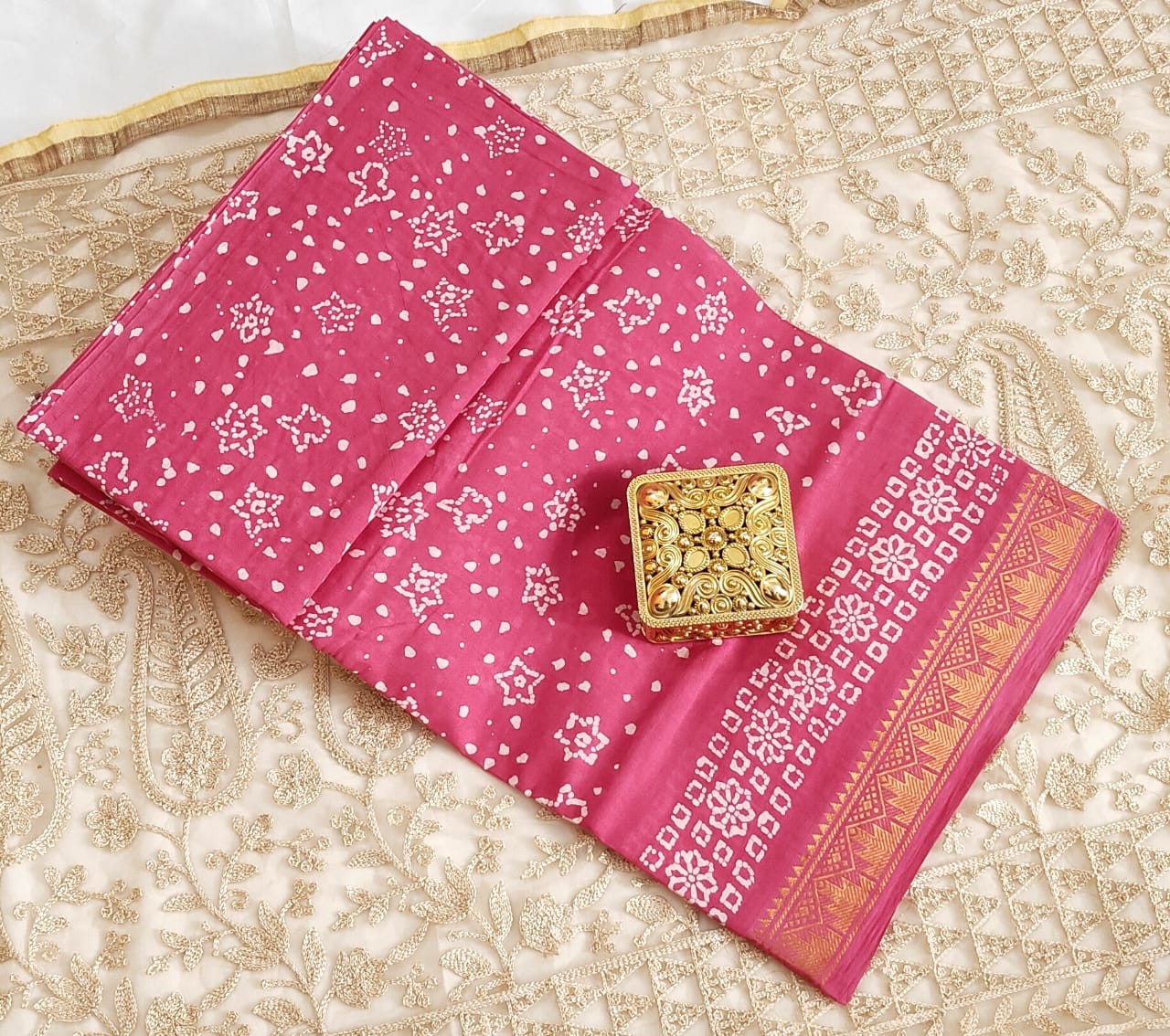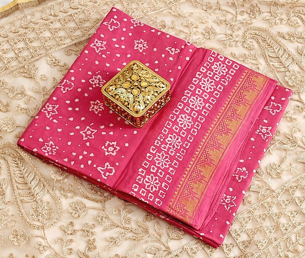 Add a splash of tradition to your wardrobe with this stunning Pink Cotton Saree featuring classic Bandhej-style prints and an elegant gold zari border β now available in hand stock at Saadhvi Fashion World!