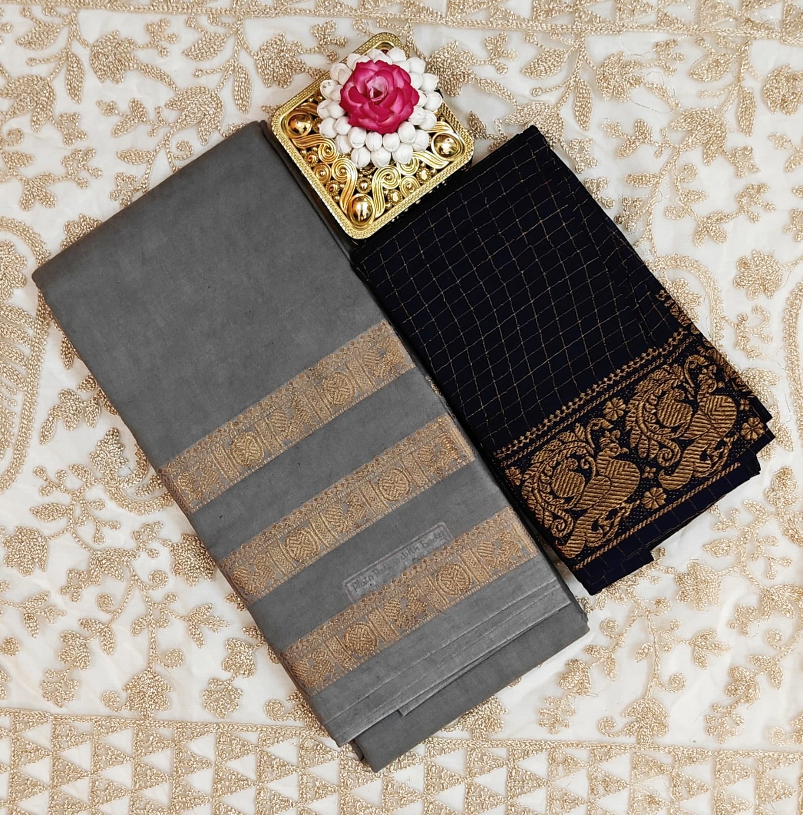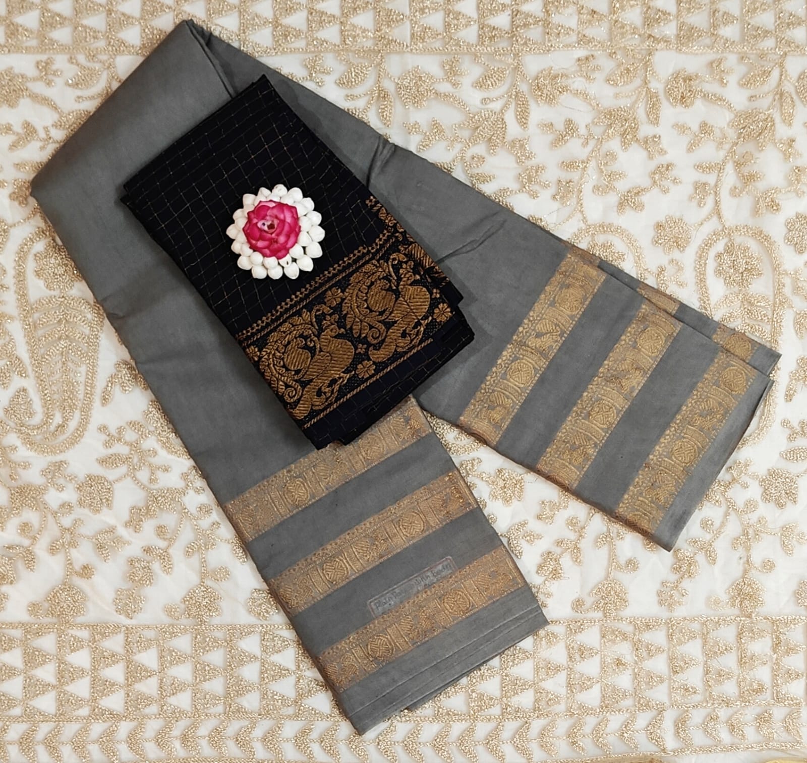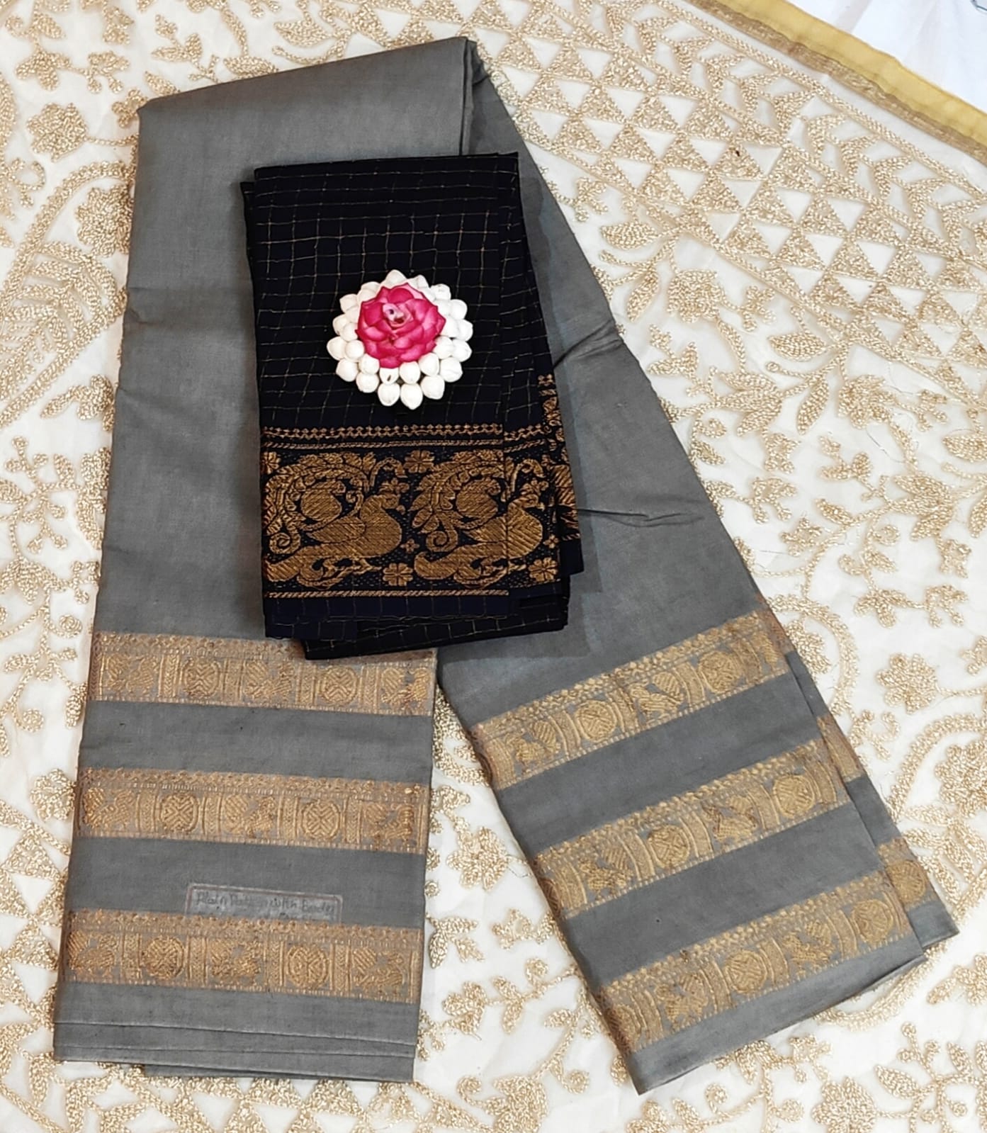 Introducing our premium power loom cotton saree in a stunning grey & antique gold combo, available now in exclusive hand stock at Saadhvi Fashion World!