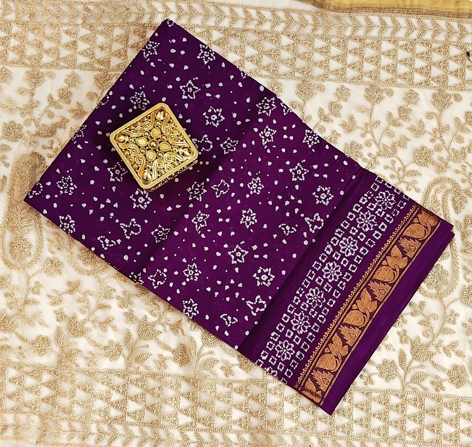 "Royal Radiance β Purple Bandhani Saree with Golden Zari borders"