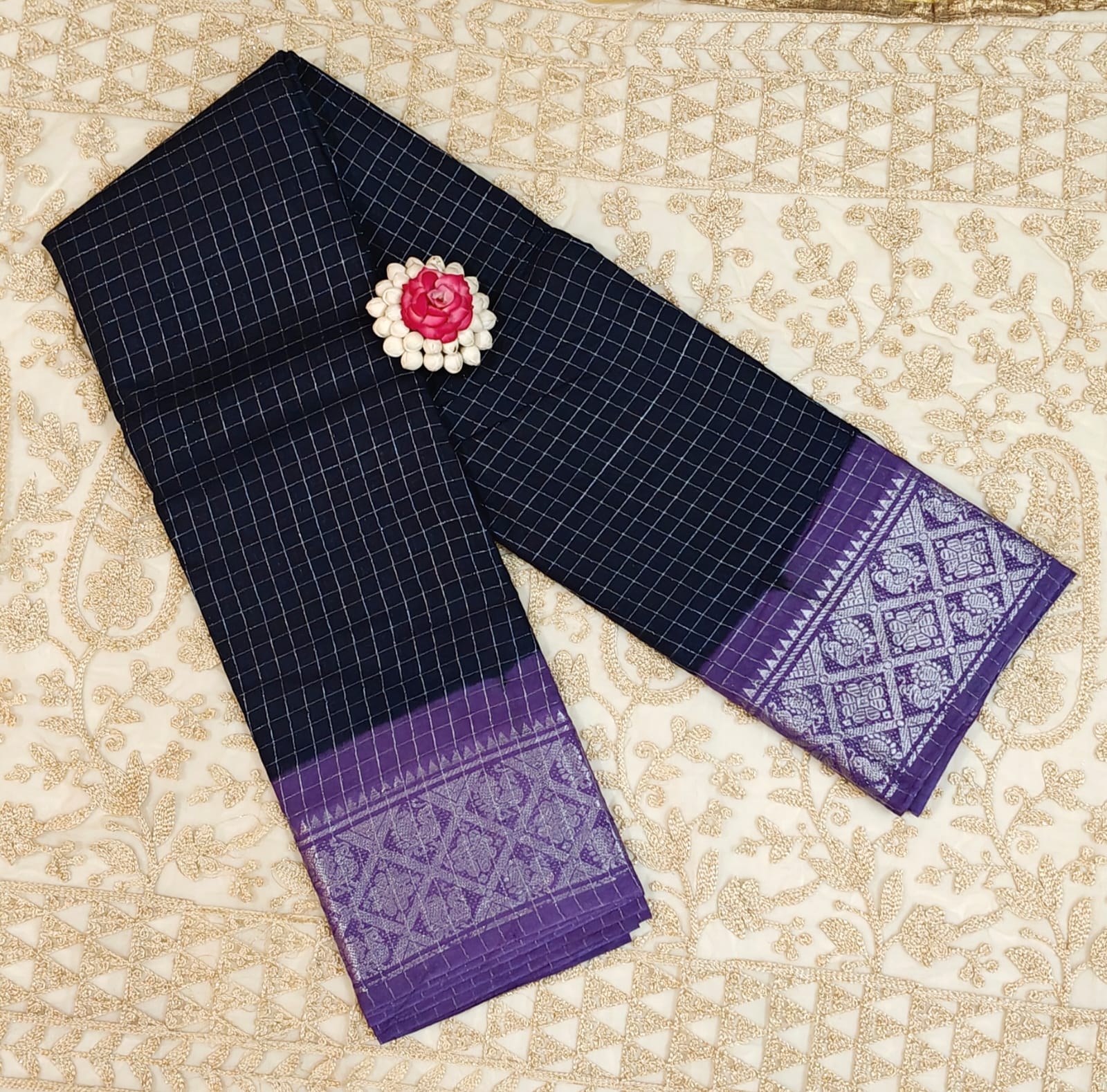 Elevate your ethnic style with this sophisticated black saree featuring fine white checks and a vibrant purple zari border. The timeless design and elegant finish make it perfect for both casual and festive occasions.