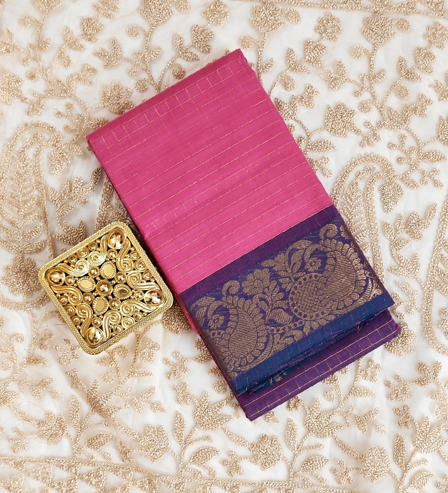 Sungudi Zari – Off and Off Series | pink & violet Checked Cotton Saree"