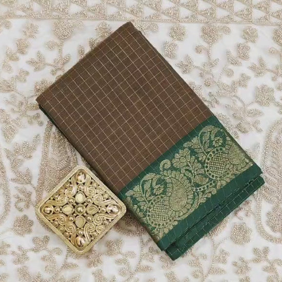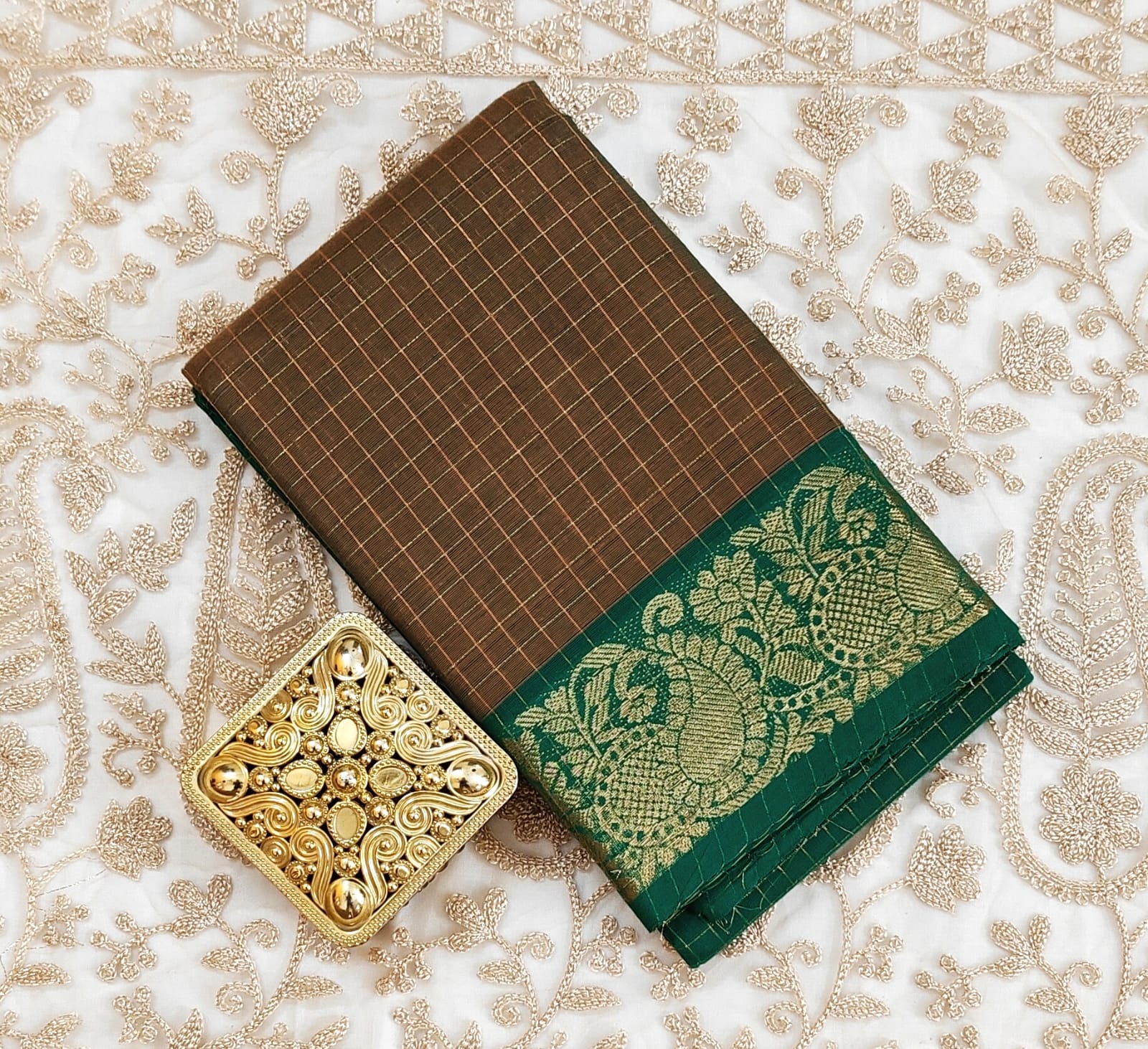 Sungudi Zari β Off and Off Series | Green & Coffee Brown Checked Cotton Saree"