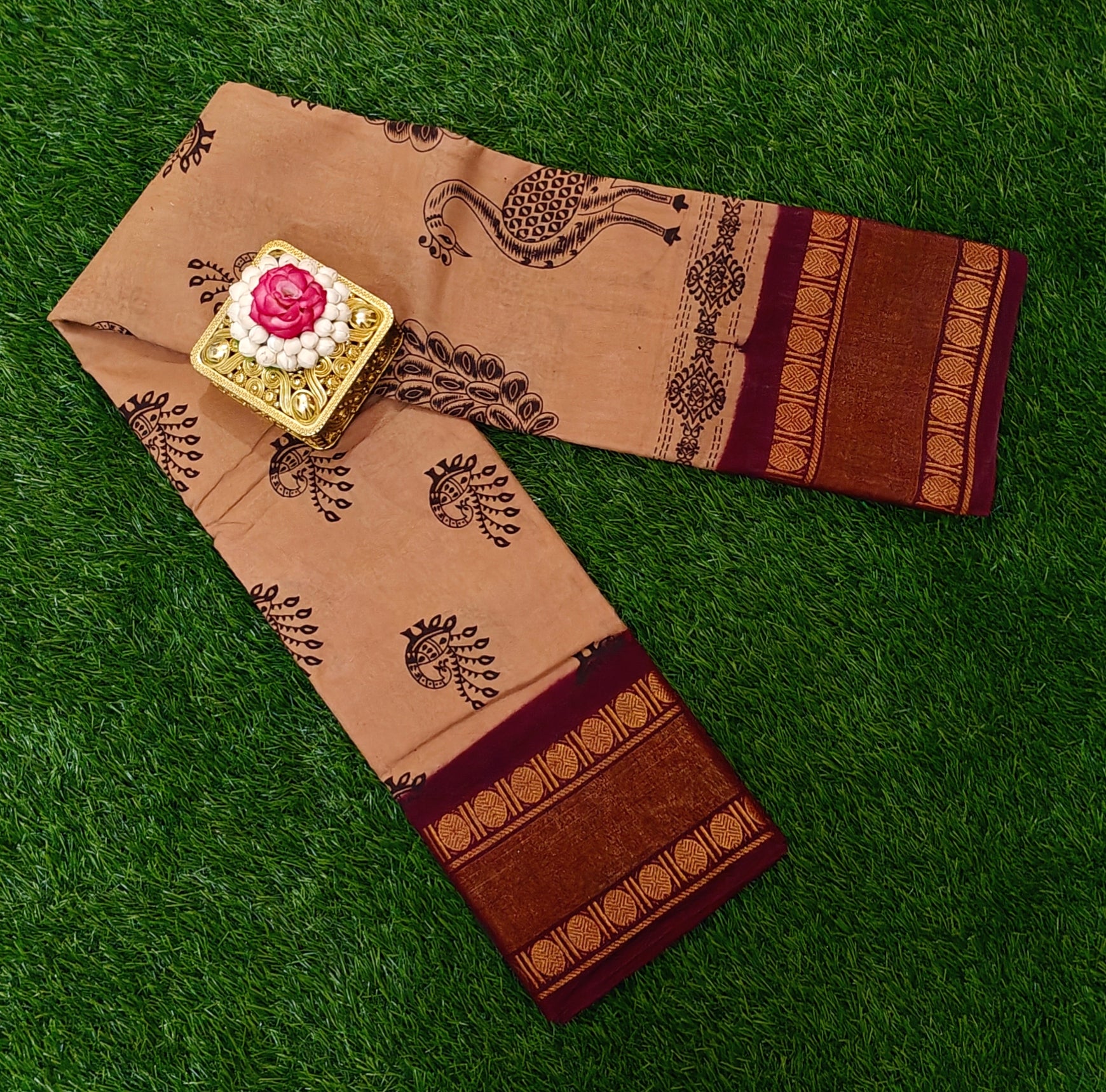 Beige Sungudi Cotton Saree with Traditional Double Border